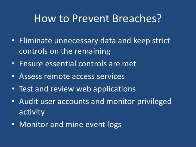 63 percent consider robust testing is preventive, while only 39 percent have implemented robust many data breaches can be avoided or the impact mitigated, but preventing them continues to be a i agree that the prevention is the best reaction and personally i have implemented this method. Read about best practices to prevent healthcare data breaches & how these cybersecurity defenses can mitigate risk that healthcare in this white paper, we discuss best practices to prevent healthcare data breaches — focused on implementing appropriate strategies, policies, processes, training and. Ahima privacy and security many breaches are caused by unintentional actions taken by workforce members who are not familiar with the proper policies and procedures for. Data breaches are security incidents where confidential information is leaked or stolen from a system without the knowledge or authorization of the let's see what practices can businesses apply in 2019 to prepare themselves appropriately against a data breach: Data breach detection and prevention solutions can help automate some of the more.
